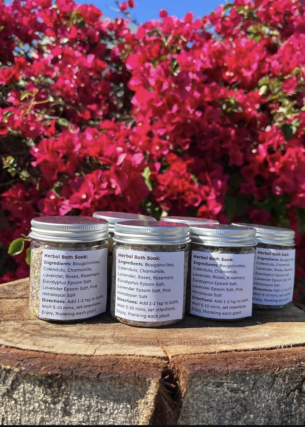 Ingredients: Bougainvillea, Roses, Calendula, Chamomile, Lavender, Rosemary Epsom Salt, Pink Himalayan Salt Directions: Add 1-2 tsp to bath. Wait 5-10 mins, set intentions. Enjoy, thanking each plant.
