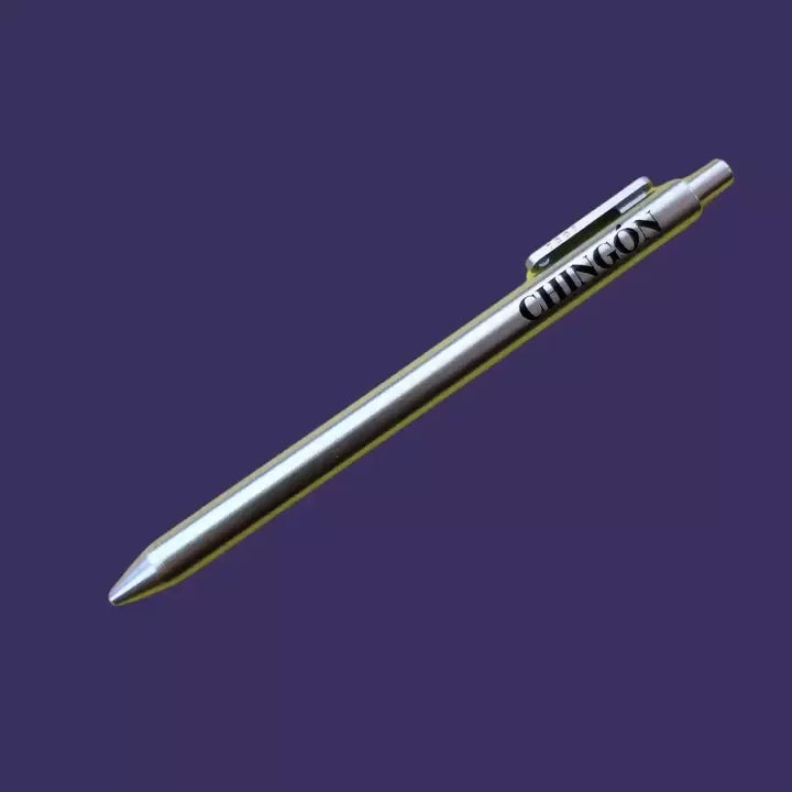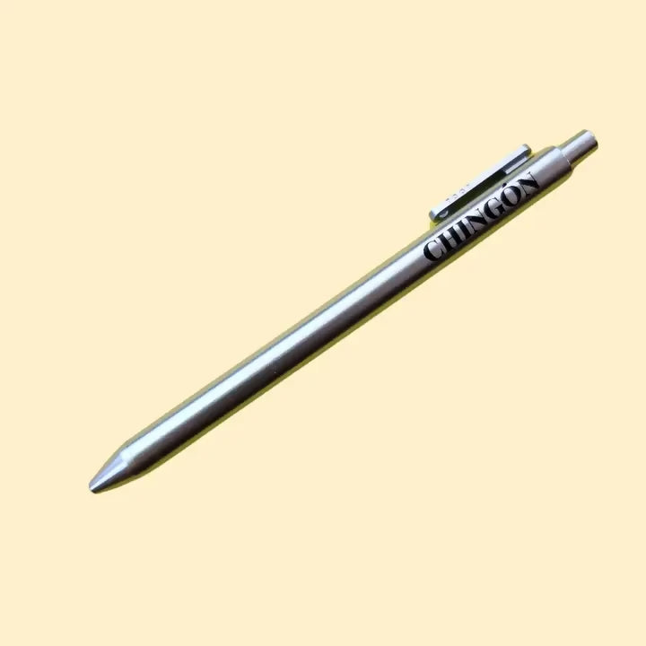 This is your new favorite pen! A soft touch surface with a fine point gel tip. Silver barrel reads Chingón. Writes in black ink.