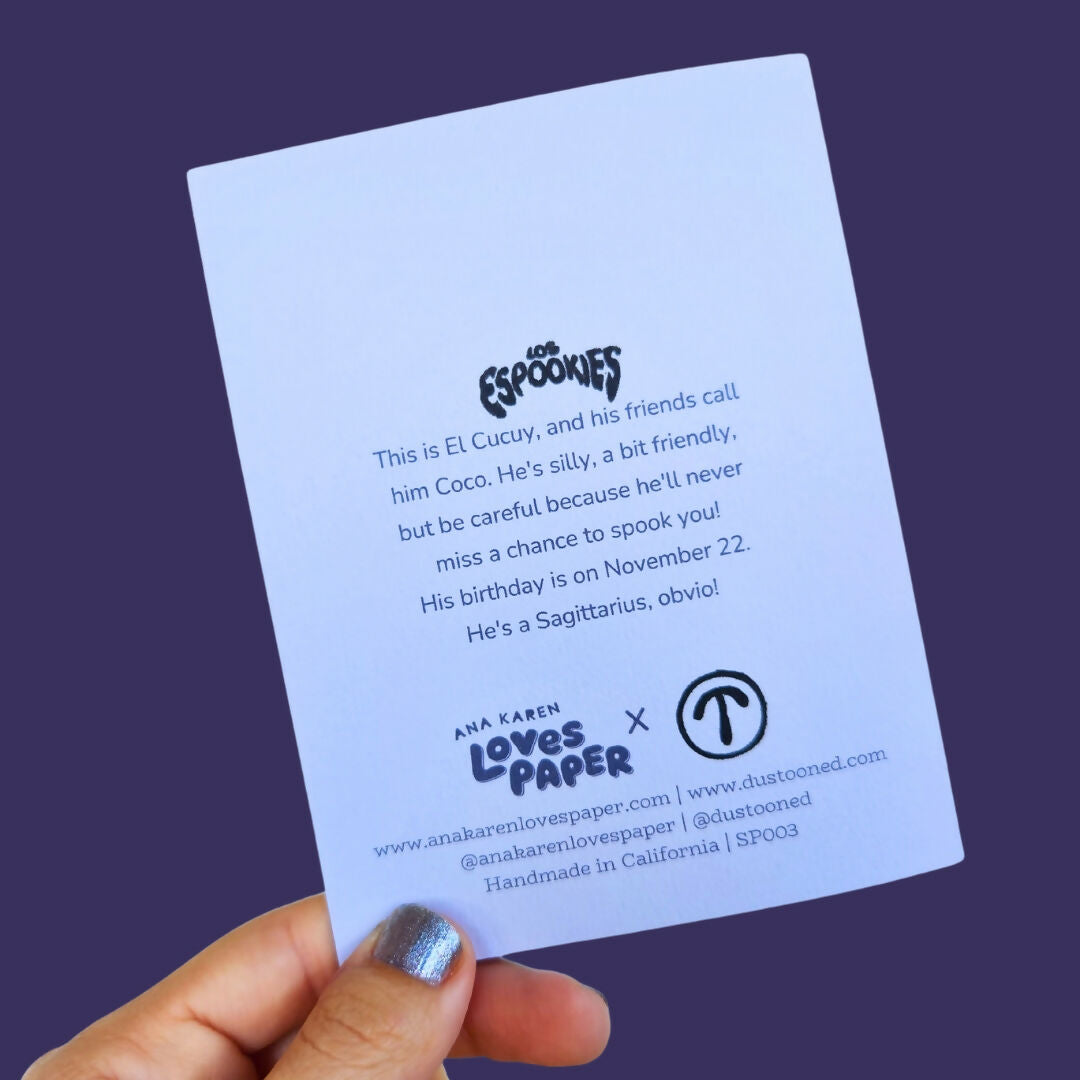 Let someone know how crazy you are about them with this card featuring Coco, El Cucuy from Los Espookies. The card reads that reads "I'm cucuy about you!"