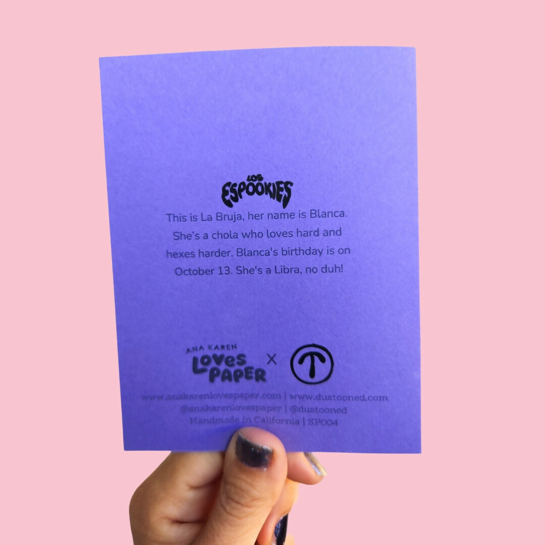 This card featuring La Bruja from Los Espookies reads "Me tienes embrujadx," which translates to "You have me bewitched." Give this card to the one you can't stop thinking about to let them know you're under their spell