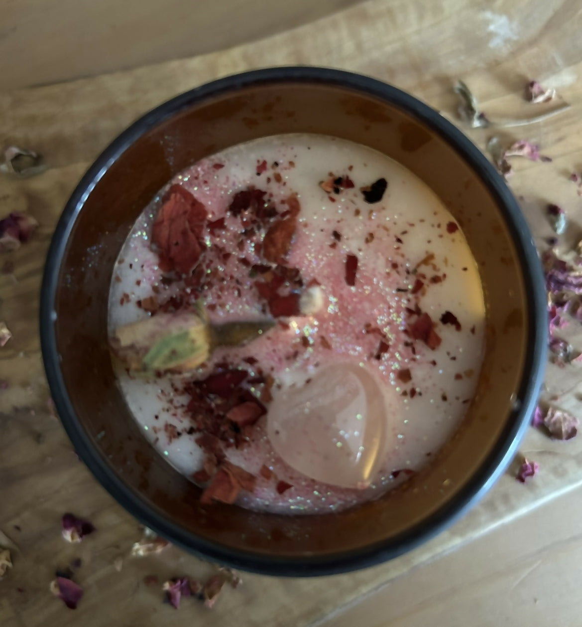 Hand poured intention candle to invite self love, a romantic partner, or platonic love. Infused with rose scent and rose petals, nestled around a rose quartz