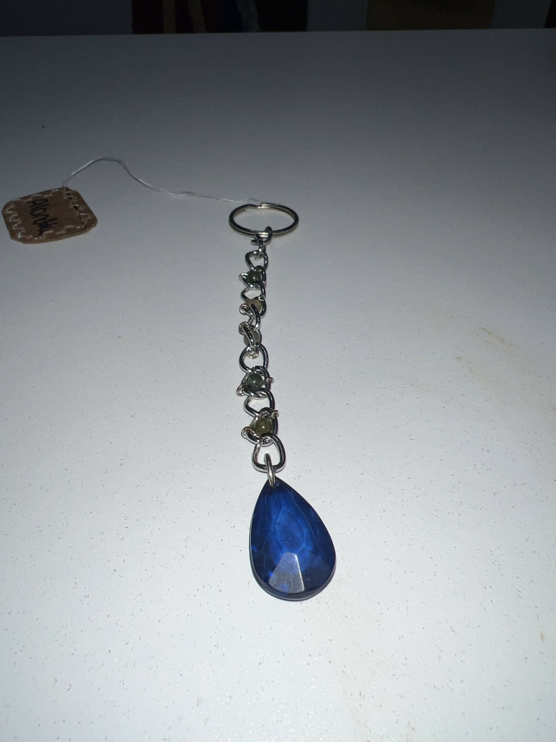 This key chain feature recycled beads in the chain links and raindrop like bead.