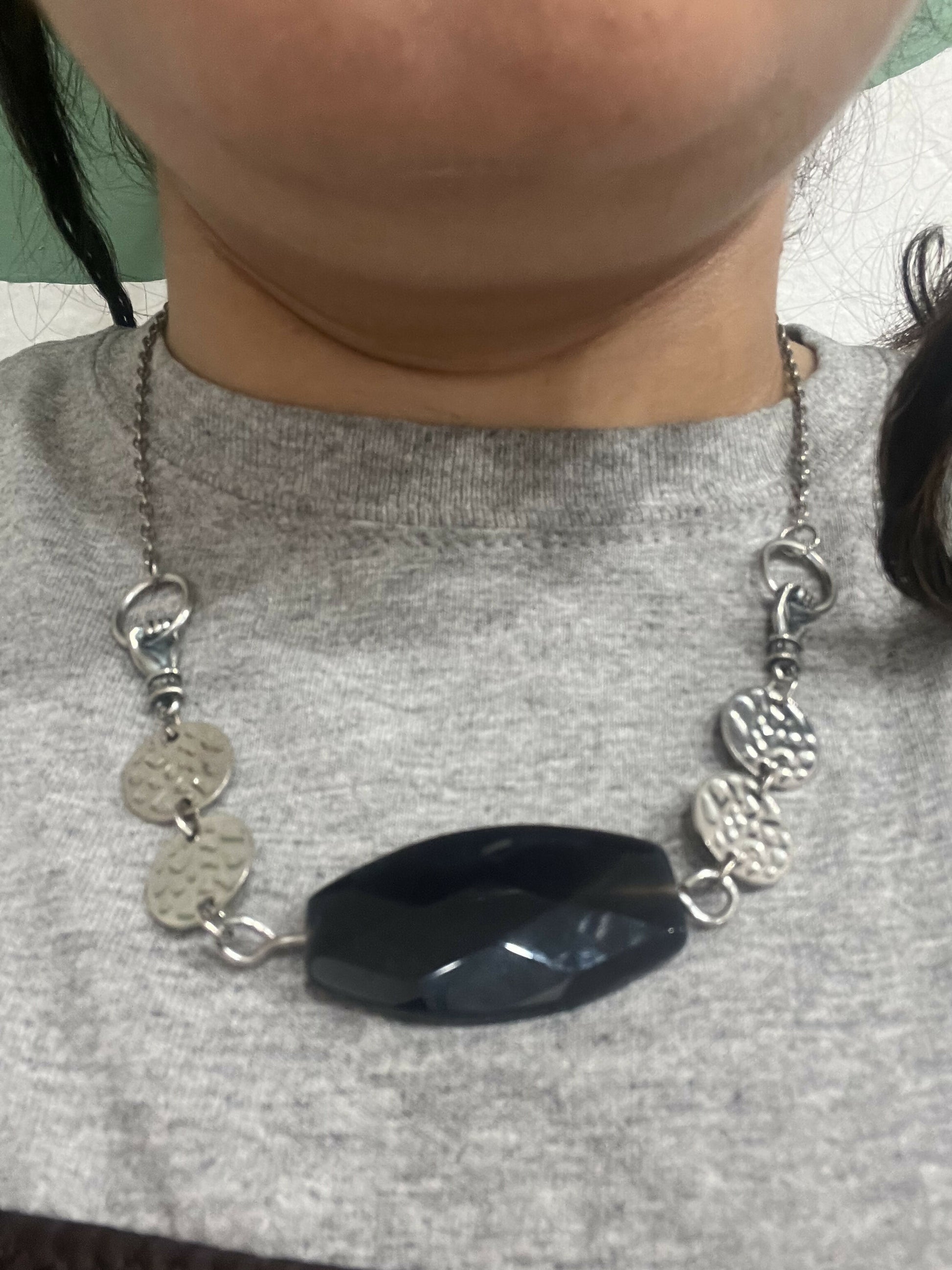This necklace features a large dark bead as the center piece with silver hammers circles, and hand hoop charms. 95% of the materials used in this back lace are recycled.