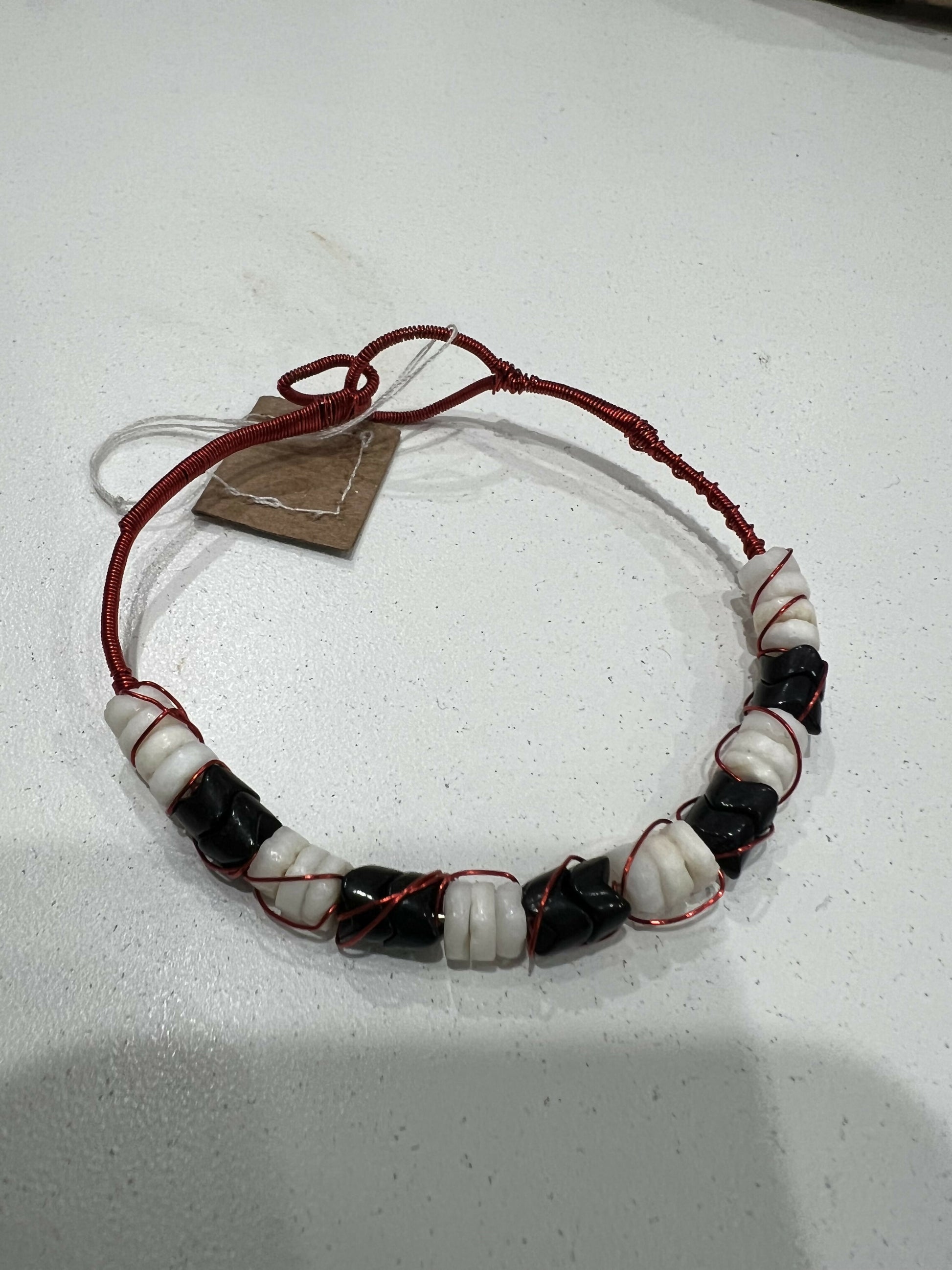 Ska baddie features black and white recycled beads wrapped in red wire.
