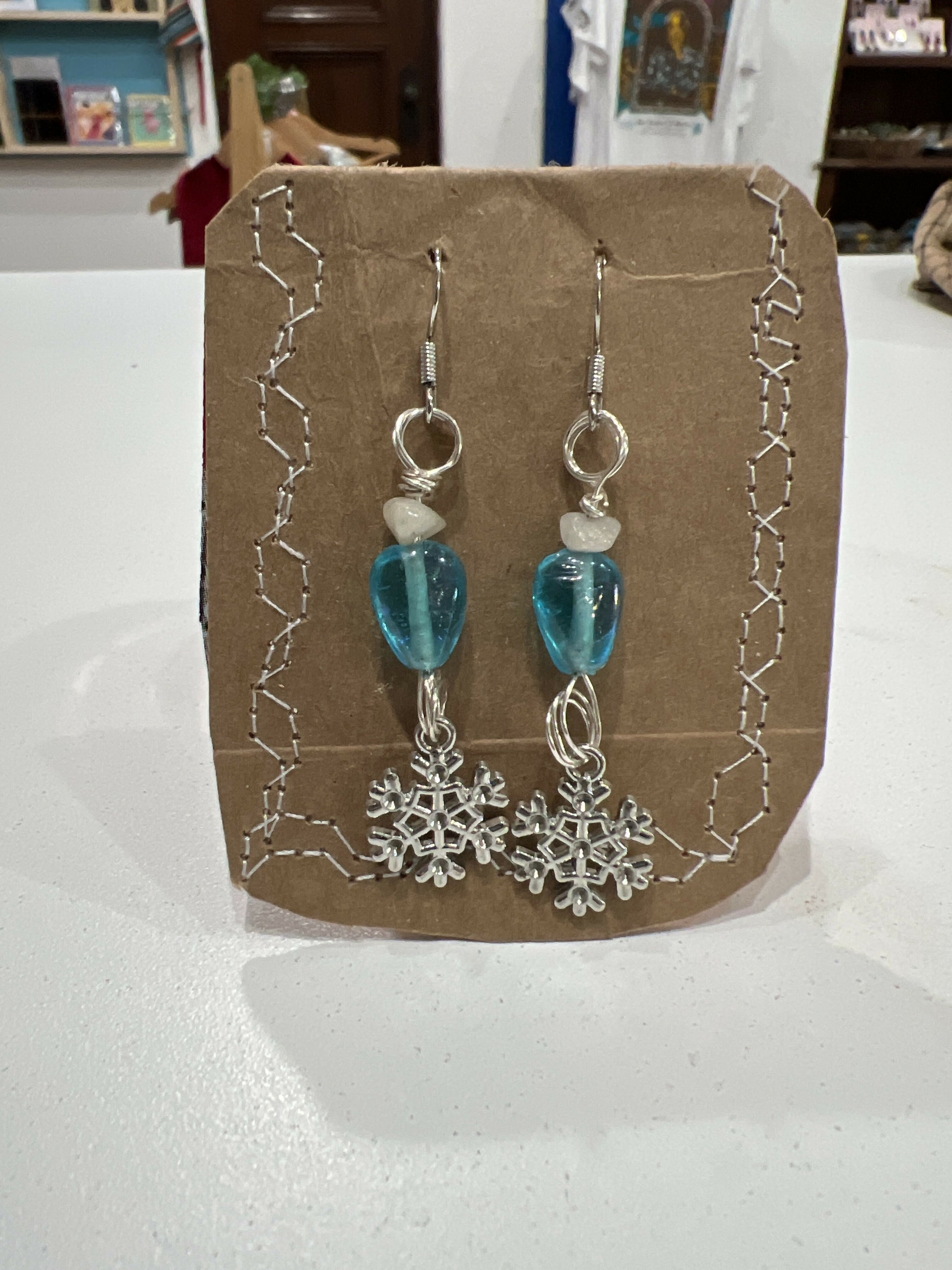 This snowflake earring feature a snowflake pendant, and a rain drop like bead above it to give a wintery vibe.